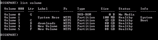 - Type list volume, on pressing enter a list of all the drives on your computer will appear in front of you.