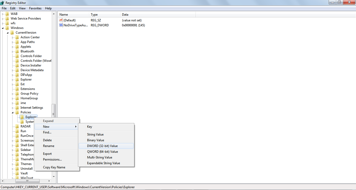 - Now locate the HKEY_CURRENT_USERSoftwareMicrosoftWindowsCurrentVersionPoliciesExplorer where you will create a new DWORD (32-bit) Value by Right Clicking in the Right Pane as Shown below in the Image